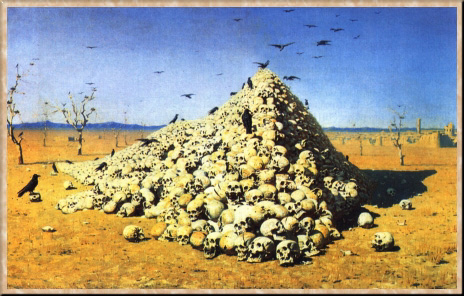 Философским размышлением о трагических последствиях любой войны была картина Верещагина "Апофеоз войны" (1871). Художник изобразил гору черепов, возвышающихся, подобно пирамиде, среди выжженной солнцем пустыни. Лишь вороны кружат над ней да развалины восточного города на горизонте говорят о некогда бывшей здесь жизни. Сюжет картины реален: "пирамиды черепов" воздвигались на Востоке как в эпоху Тамерлана, так и в более поздние времена. "Апофеоз войны" стал ее страшным символом. Не случайно на раме картины художник сам написал посвящение: "Всем великим завоевателям, прошедшим, настоящим и будущим".