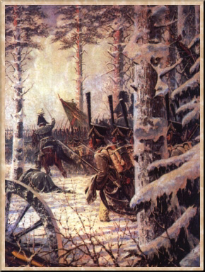 Вернувшись в Россию, Верещагин задумал новый цикл картин, теперь уже из отечественной истории, под общим названием "1812 год. Наполеон в России". Создавалась она на протяжении 1887-1904 гг. и должна была представлять монументальную эпопею, посвященную народной войне. В картине "Не замай, дай подойти" показана партизанская засада в глухом заснеженном лесу. В произведении "На большой дороге.