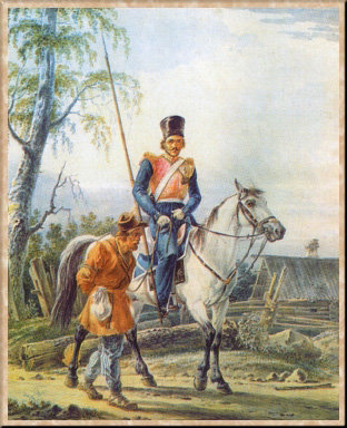 Верховой казак, конвоирующий крестьянина.1820-е.Акварель