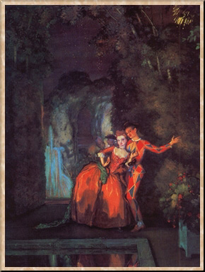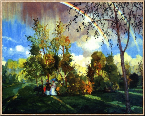 Стилизованные пейзажные мотивы с ретроспективным оттенком XVIII в. прослеживаются в таких картинах, как "Вечер" (1902), где ритм повторяющихся аркад и боскетов гармонично сочетается с плавными движениями дам в причудливых туалетах. Чарующий неподвижный пейзаж, плоскост-ный и декоративный, характерен и для картины "Волшебство" (1920) с ее томной и жеманной героиней.