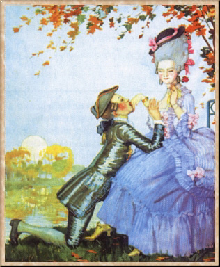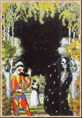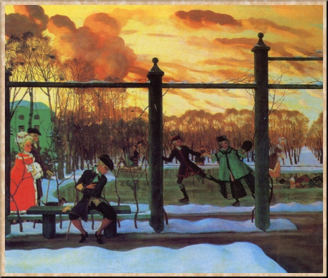 Любование и гротеск сопровождают настроение многих ретроспекций Сомова. Таковы картины "Эхо прошедшего времени" (1903), "Арлекин и смерть" (1907), "Осмеянный поцелуй" (1908), "Зима. Каток" (1915).