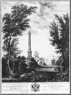 Вид колонны и храма по другую сторону пруда в саду города Гатчины. (с оригинала Сем. Ф. Щедрина). 1800. Гравюра резцом