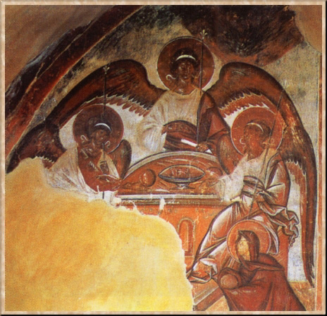 Троица. Роспись Троицкого придела в церкви Спаса Преображения на Ильине улице в Новгороде. 1378. Фреска